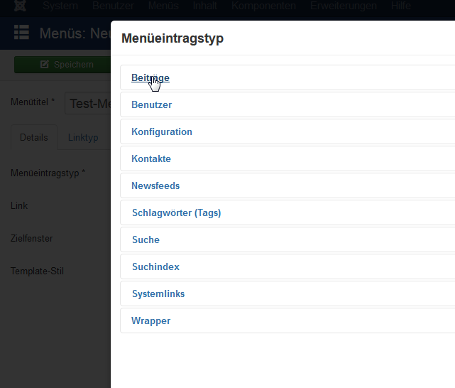 Einen Menü-Eintragstyp auswählen